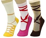 These adorable crew socks have a trompe l'oiel design of lace up ballet shoes in assorted colors.